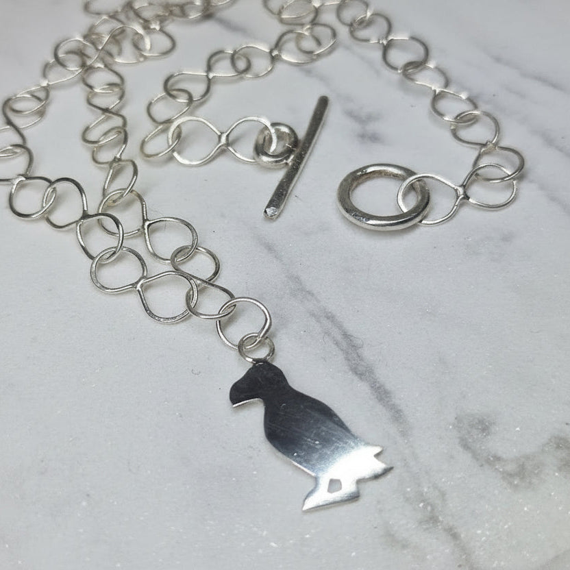 Håndlaget smykke i 925 sterling sølv med anheng designet som den ikoniske lundefuglen. Perfekt for fugleentusiater, naturbarn og noen med forkjærlighet for havet. Kan bestilles med eller uten kjede.