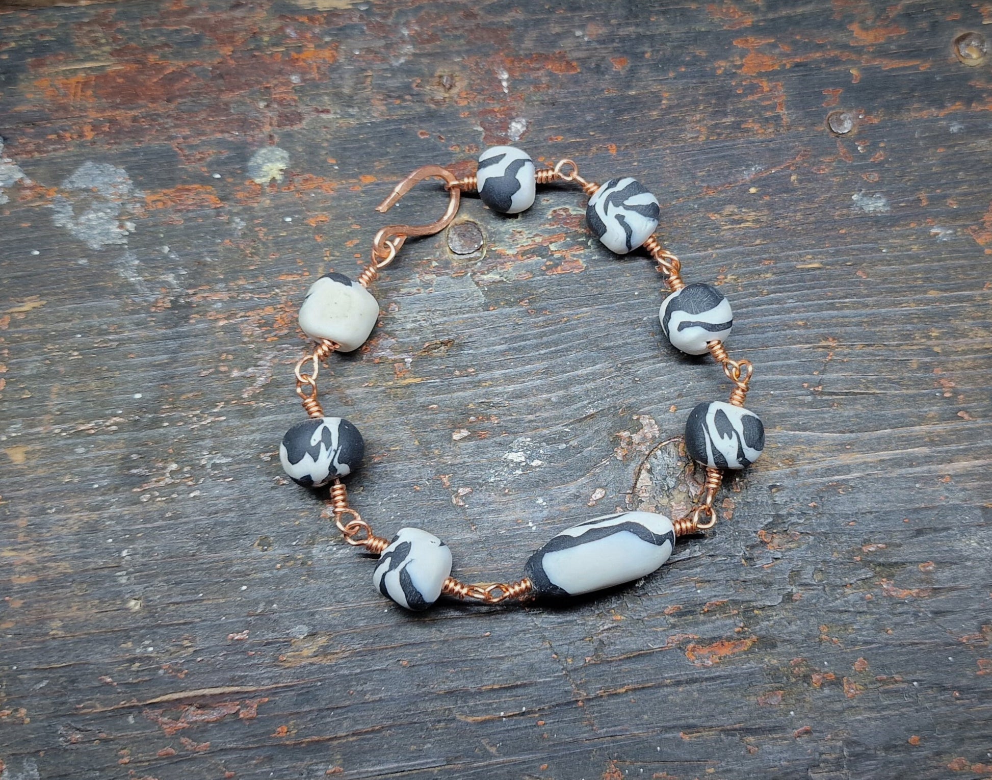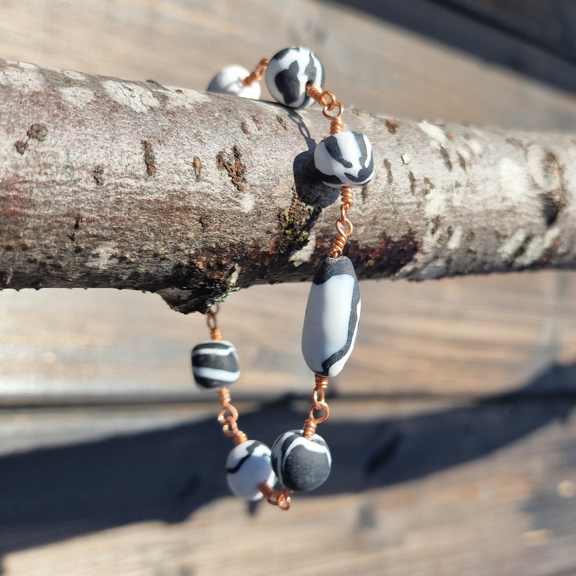 Håndlagde polymer perler i sort og hvit med matt finish med varierende størrelse og fasong.
