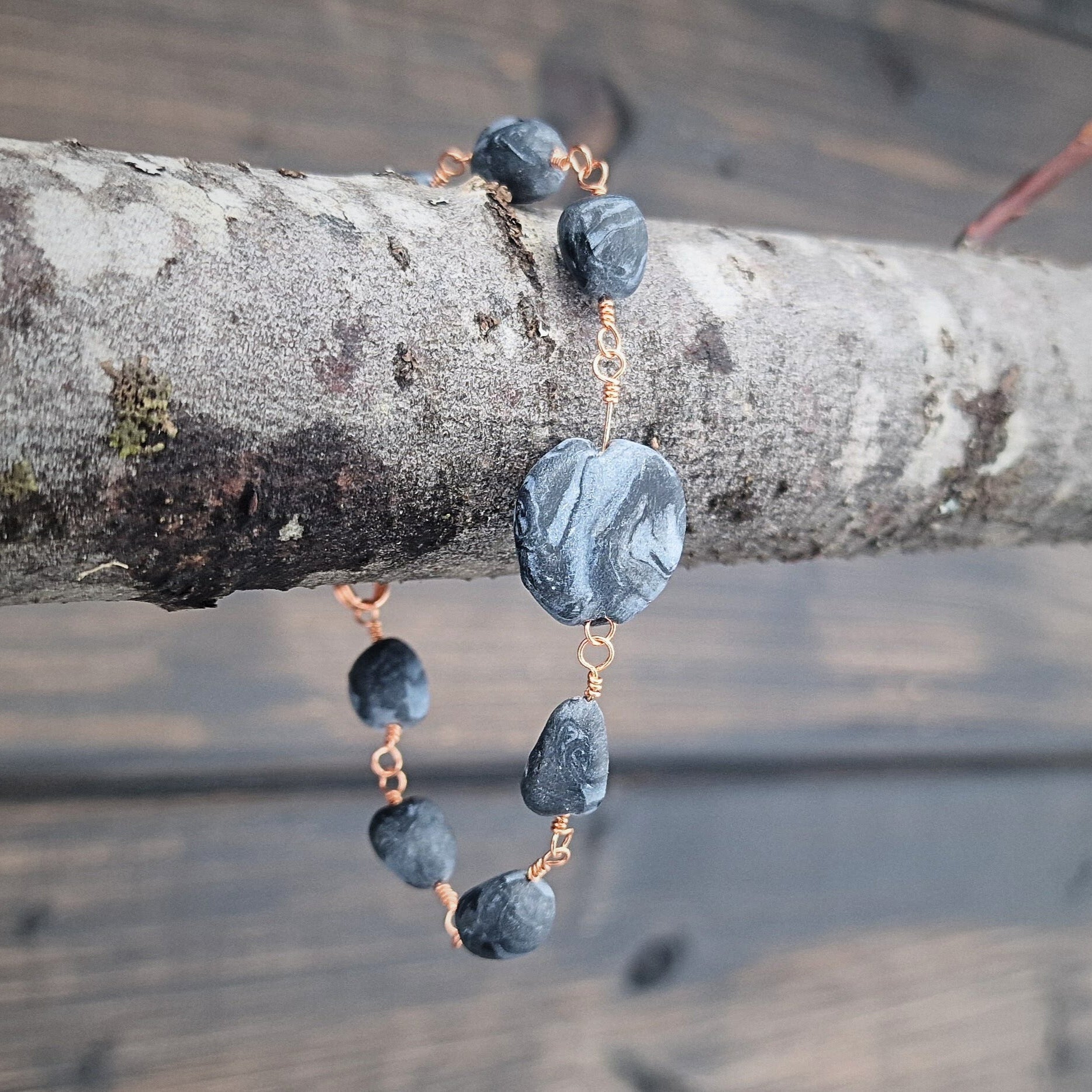 Den varme kobberfargen gir en lekker kontrast til de svarte og grå perlene.