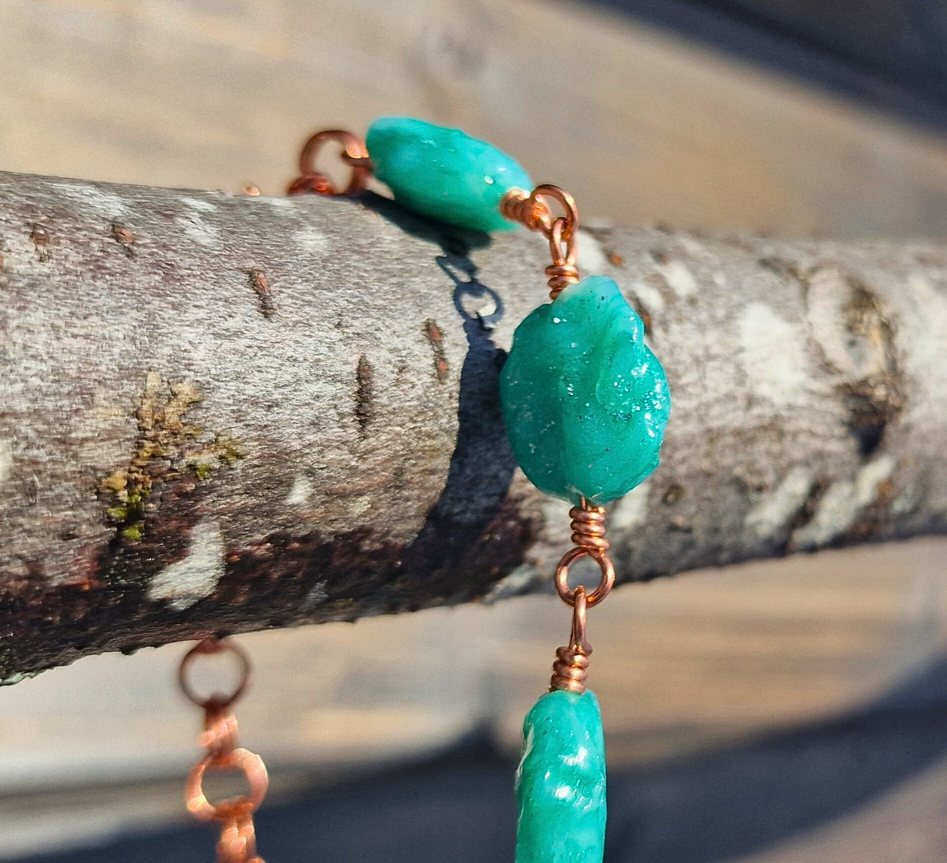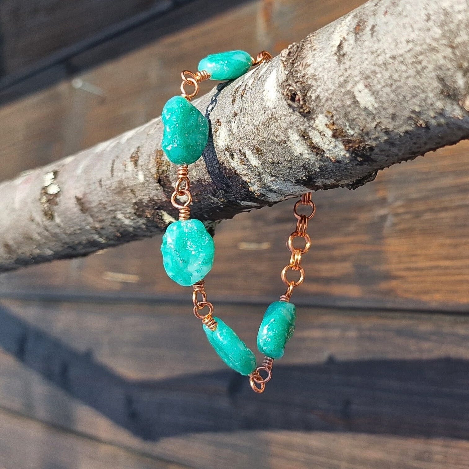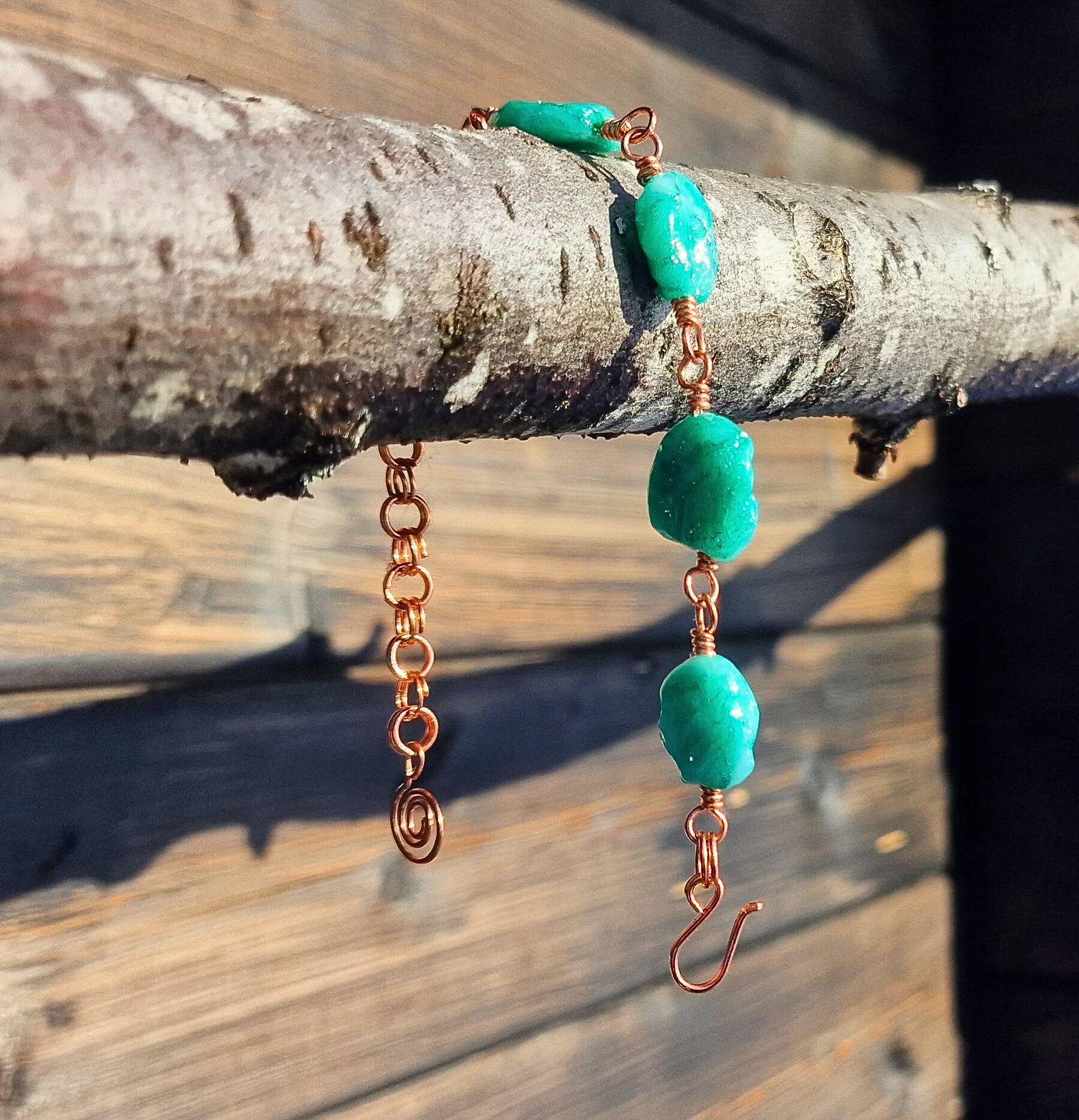 Stenene er tvunnet sammen med ren kobbertråd. Armbåndet måler ca 17 cm, men har en generøs forlengelseslenke på 6 cm. Så dette armbåndet vil passe mange forskjellige størrelser. På enden av lenken er det en spiralformet "charm" i kobber.