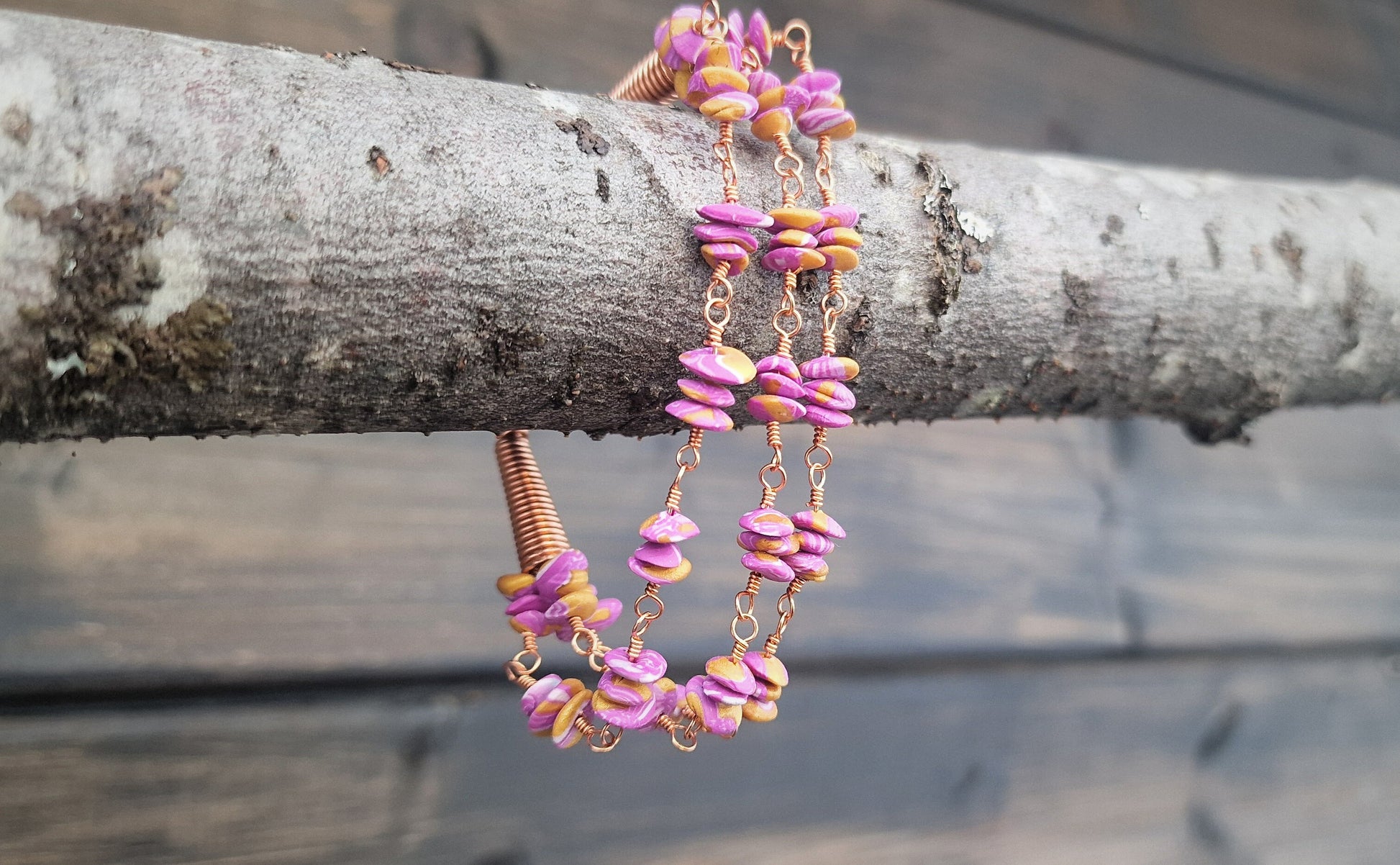 Polymerperlene er formet enkeltvis for hånd og er en blanding av rosa og gullfarget polymer leire med innslag av hvitt. Perlene har organisk form med variert størrelse og matt finish. De er tvunnet sammen i tripletter med tynn kobberstreng.