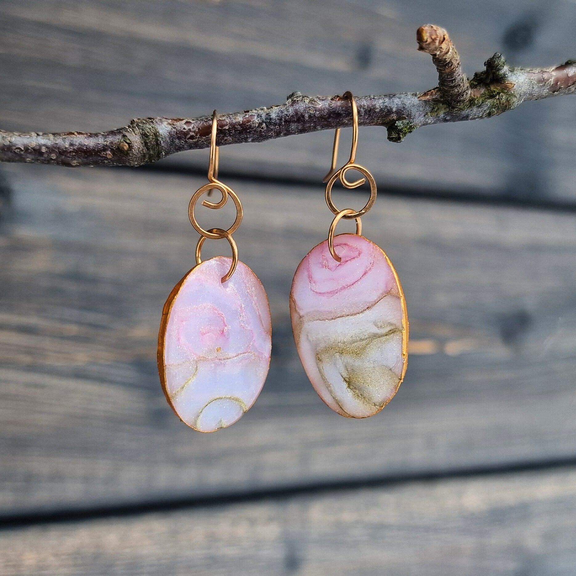 Øredobbene er nøye håndformet i polymer og farget med mica i lekre skimrende rosa og bronsetoner. De gir en diskret men vakker glans til øredobbene. De har en organisk, litt ujevn form som gir dem ett mer naturlig utseende.
