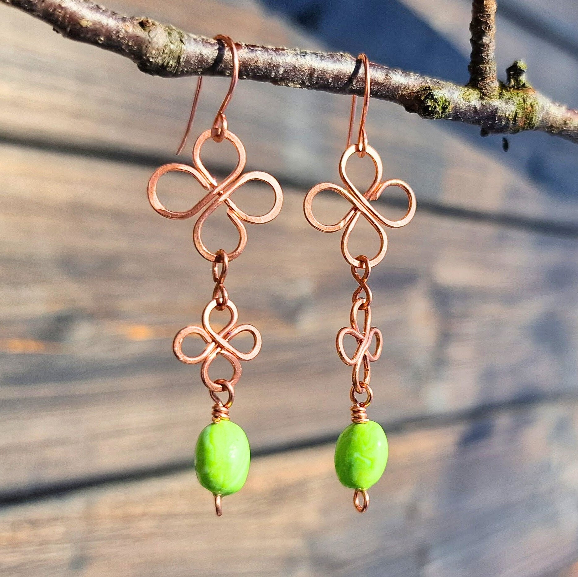 Frikløver øredobber i kobber med håndlagde perler i frisk grønn