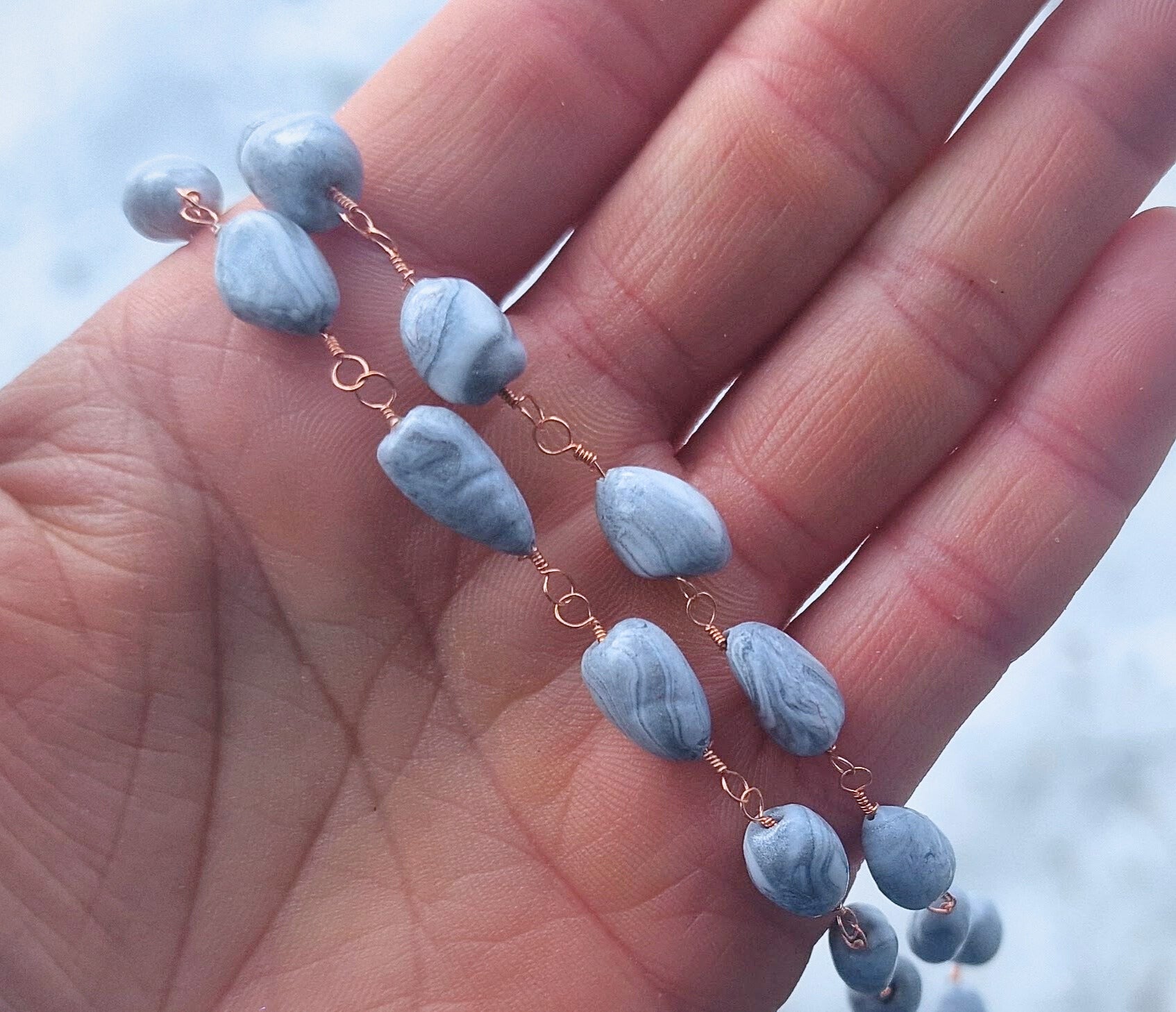 Kjedet er håndtvunnet av svært tynn kobbertråd (0,3 mm) som gir ett veldig delikat elegant kjede.