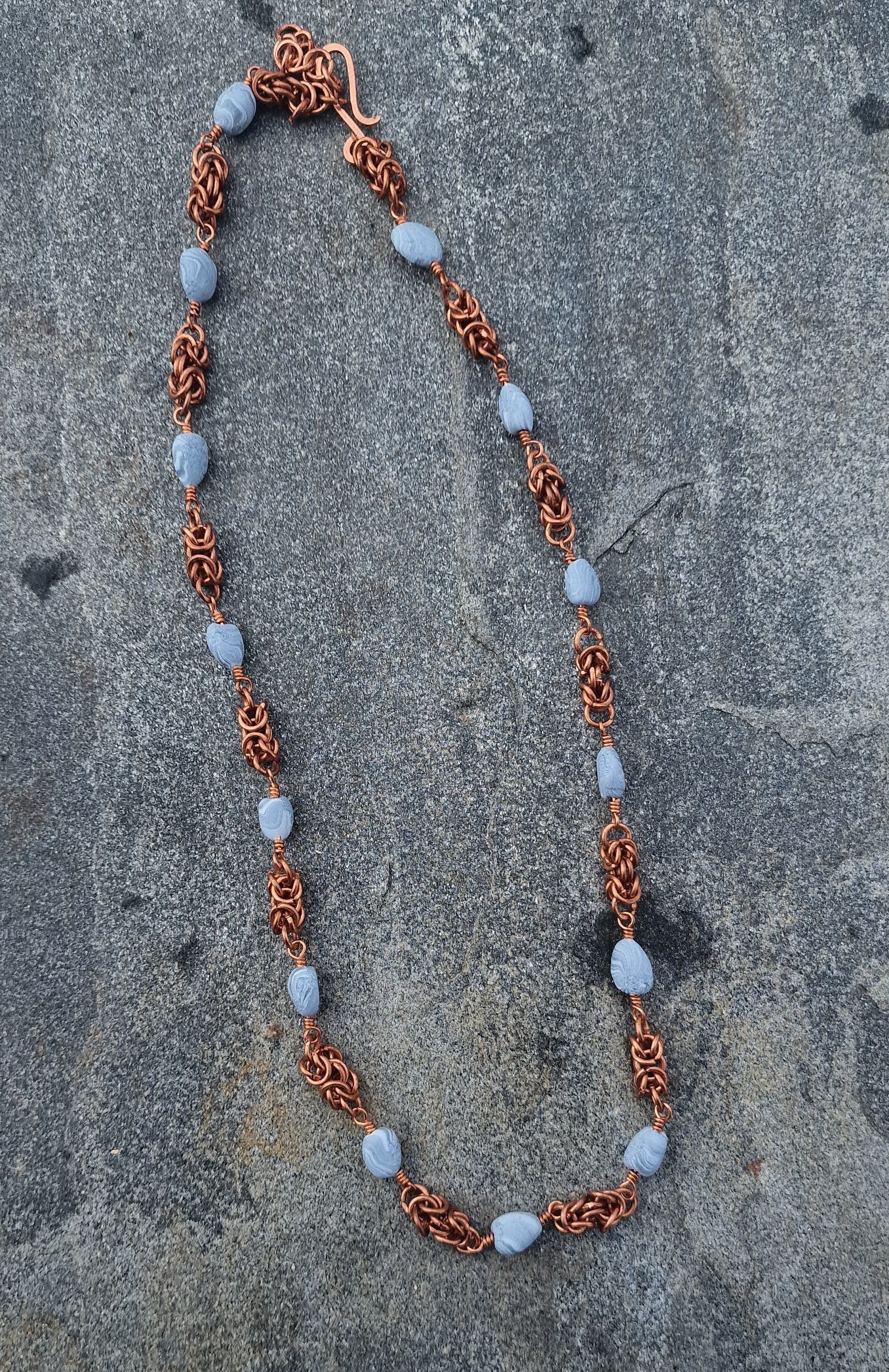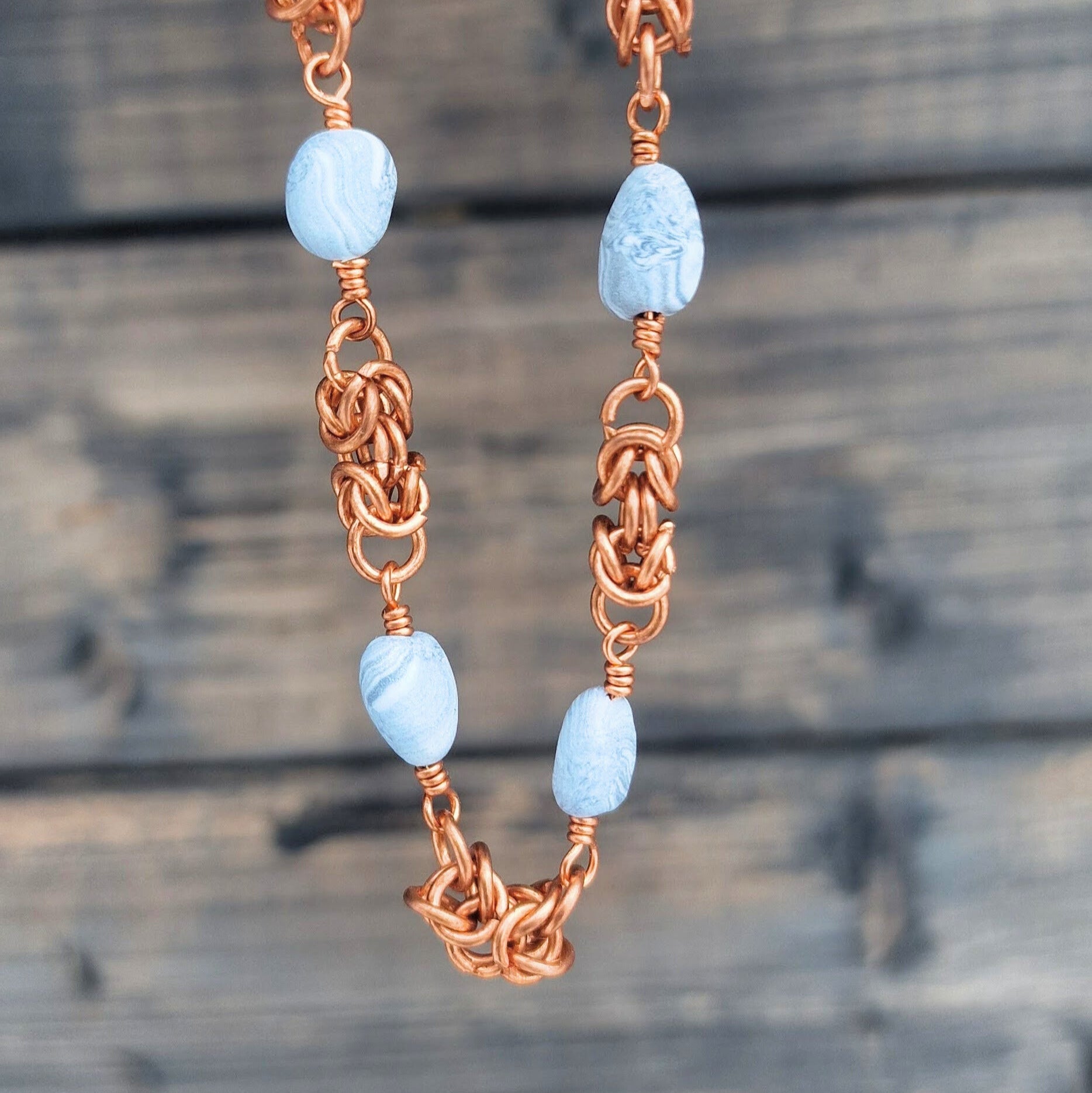 De grå-marmorerte perlene er håndformet i polymerleire og designet for å minne om steiner formet av havets bølger i fjæra – glatte, organiske og med ett naturlig utrykk. Kobberlenkene, inkludert den håndlagde hektelåsen, er laget av ren kobber og gir smykket en varm glød som står i kontrast til de kjølige grå tonene.