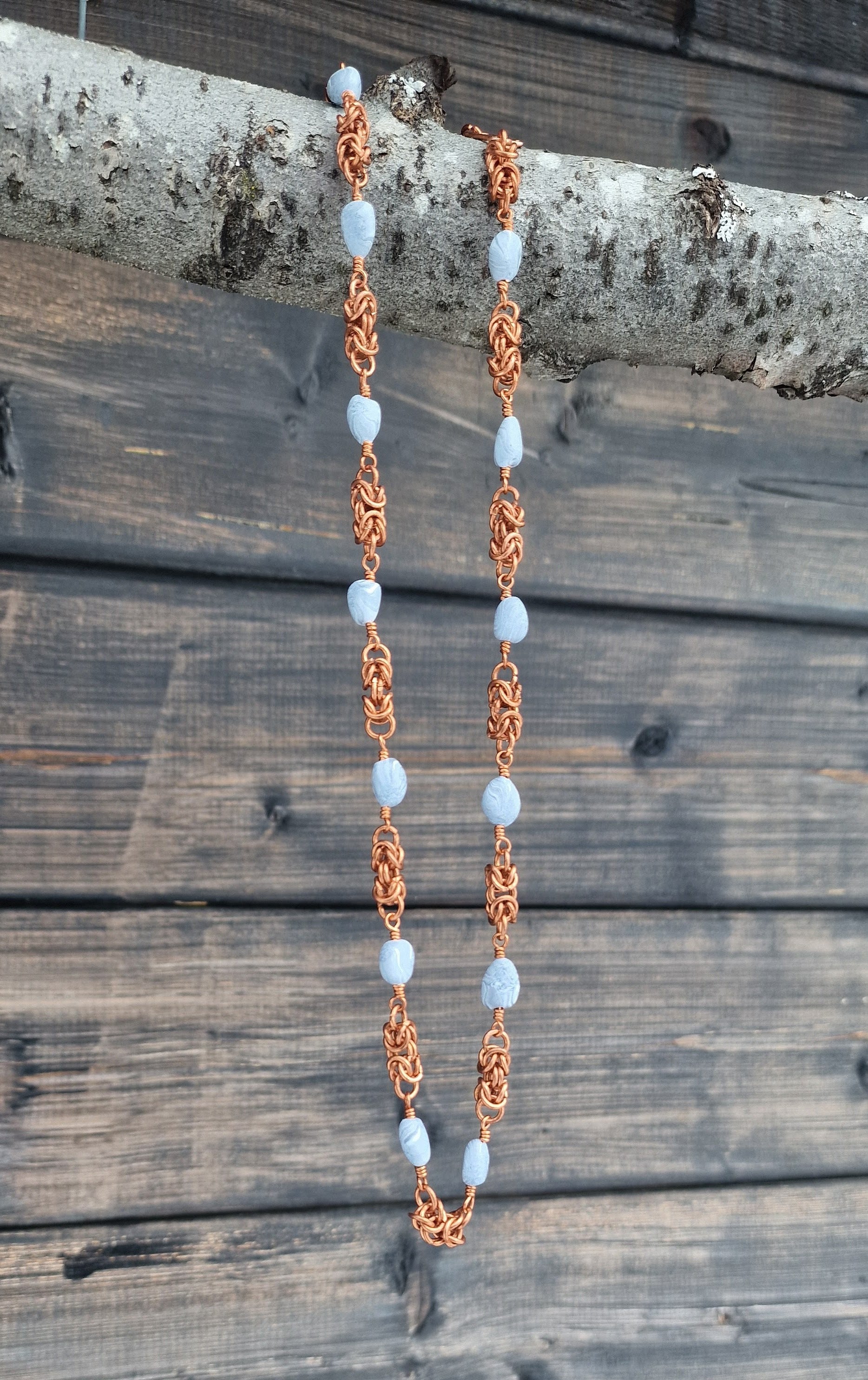 Halskjede med håndlagde perler og mellomstykker i kongelenke