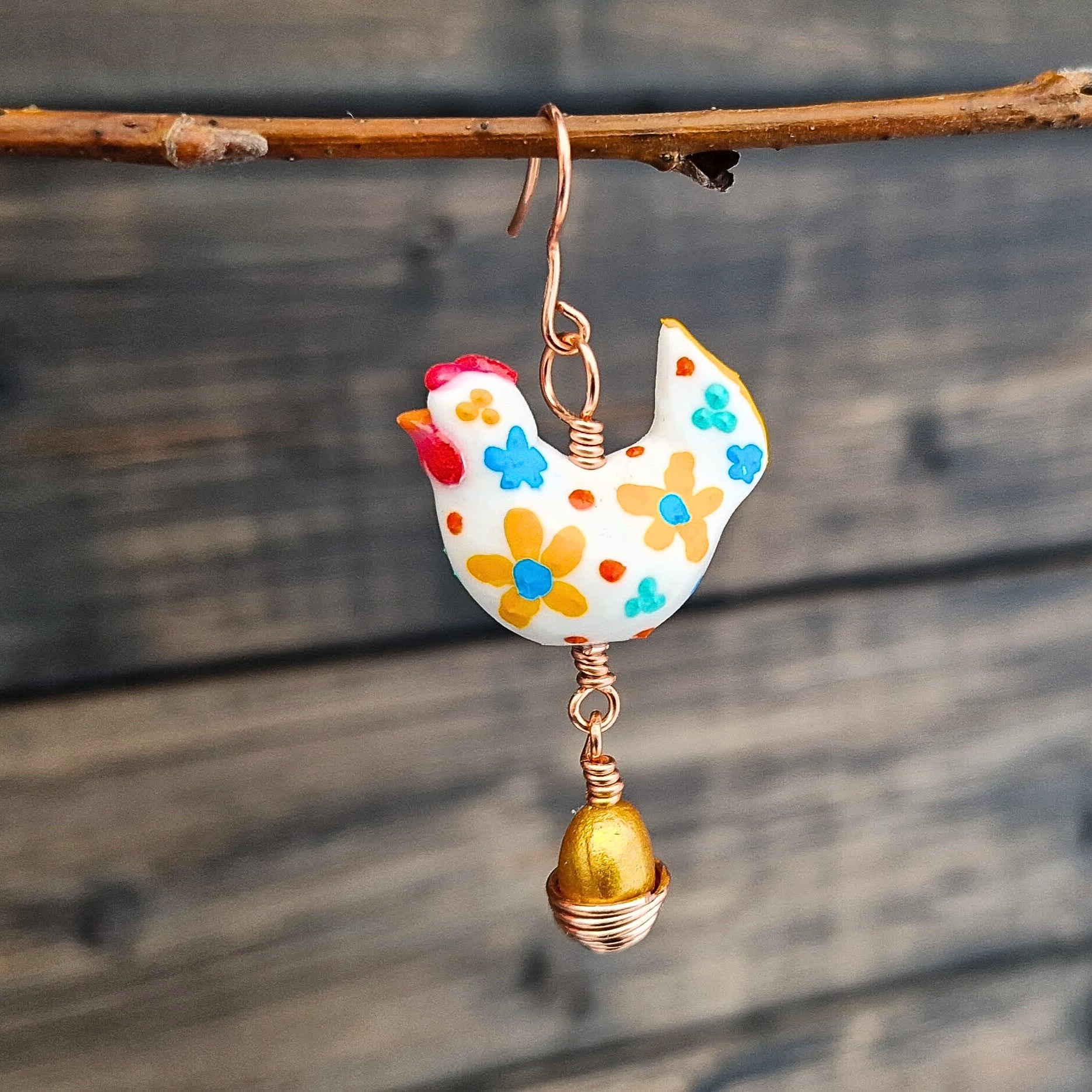 Håndlaget Hippie-Høne i polymer, med håndmalte dekorasjoner i akryl. Under høna henger det ett gull-egg i en kobber kurv. Pyntet med søte blomster i gult og blått.