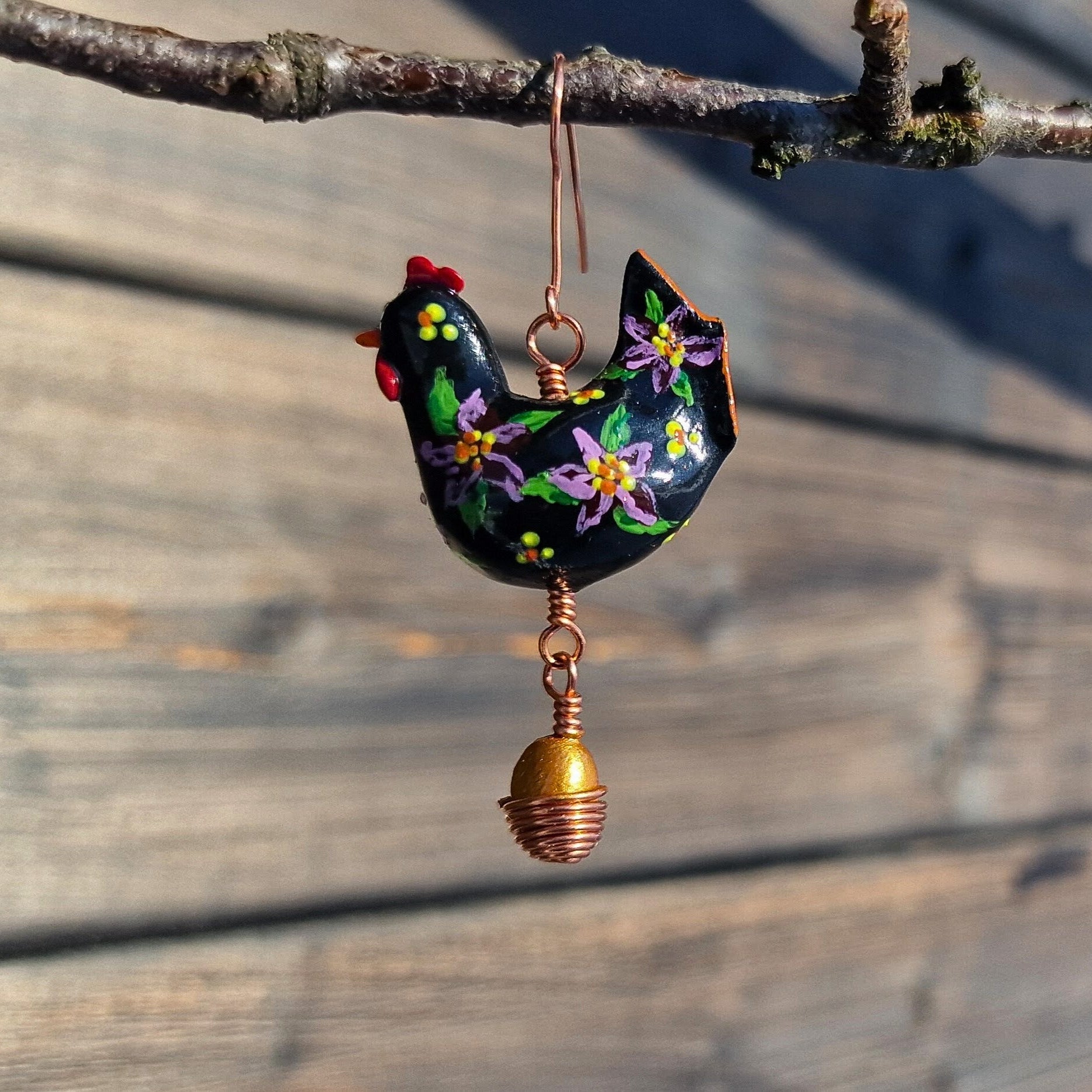 Hippie-høns er montert på en ørekrok, men de må ikke brukes som ørepynt. Heng dem opp i vinduet, eller bilspeilet som dekorasjon. Heng dem opp i potteplanter eller heng dem fast på en tesil. Eller kanskje du har ett hønsehus å henge den opp i? Bruk disse søte, små håndmalte hønene hvor som helst.