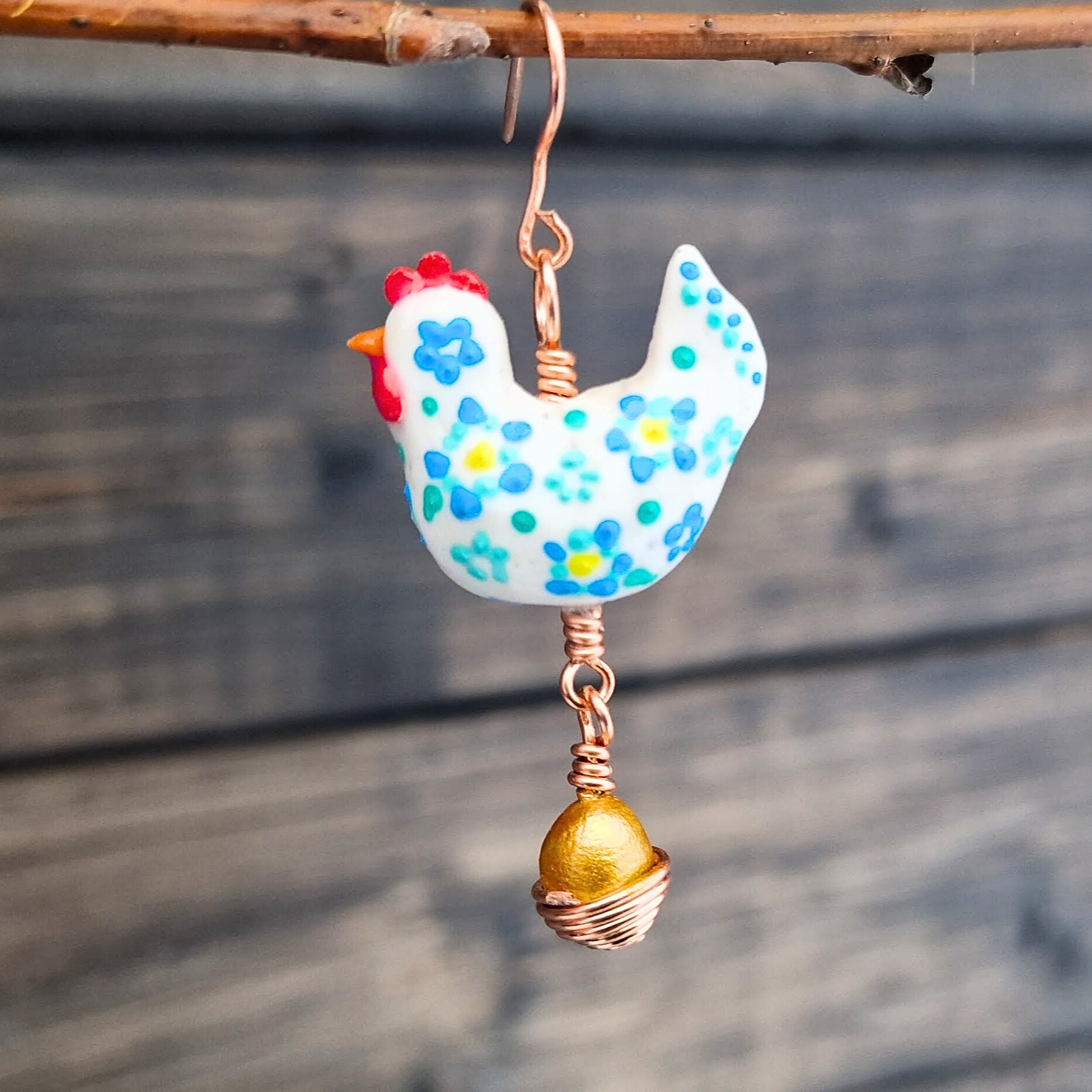 Håndlaget Hippie-Høne i polymer, med håndmalt dekorasjon i akryl. Under høna henger det ett gull-egg i en kobber kurv. Pyntet med søte blomster forskjellige blåtoner, og lakket med glanslakk