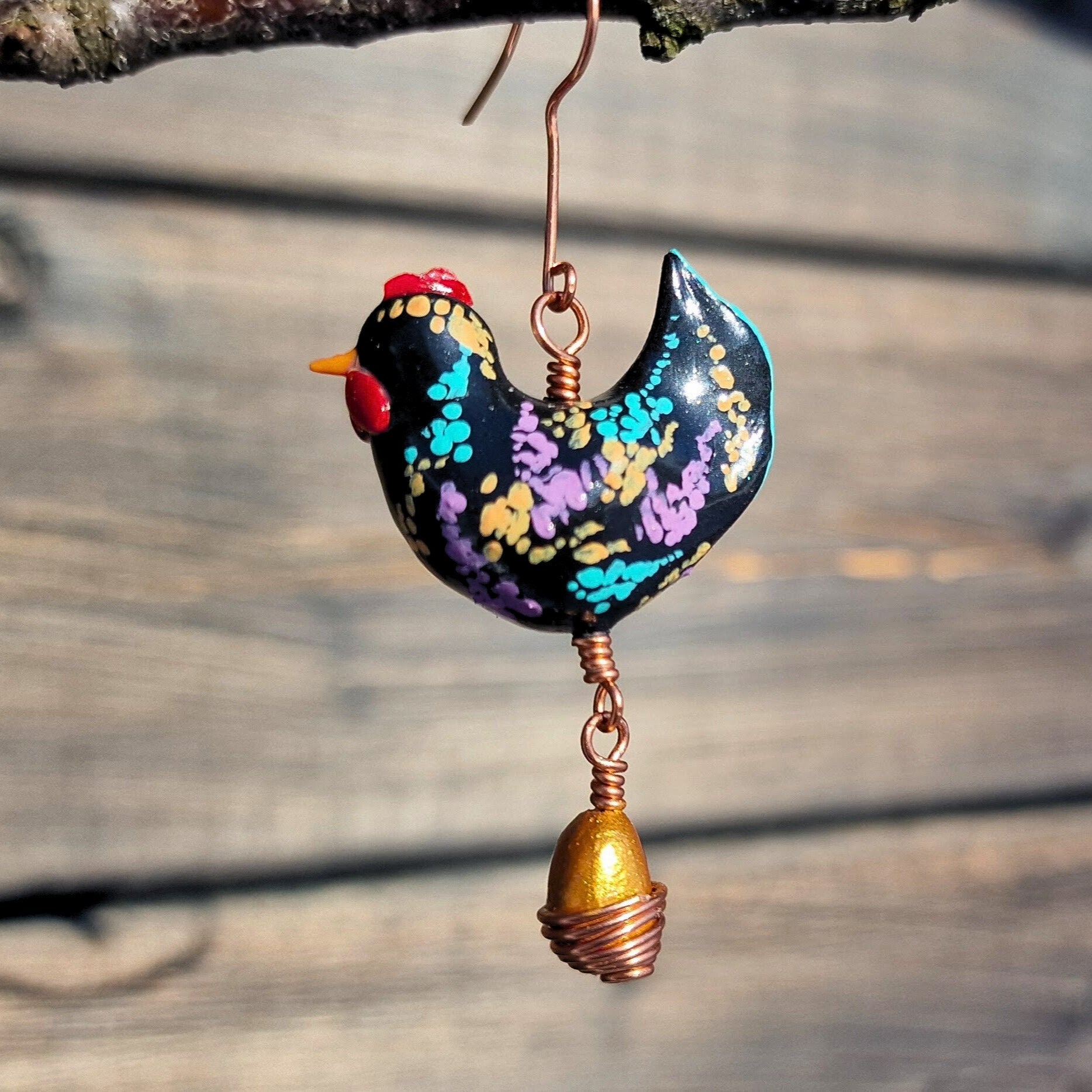 Håndlaget Hippie-Høne i polymer, med håndmalt dekorasjon i akryl. Under høna henger det ett gull-egg i en kobber kurv. Pyntet med fine farger i abstrakte mønster.