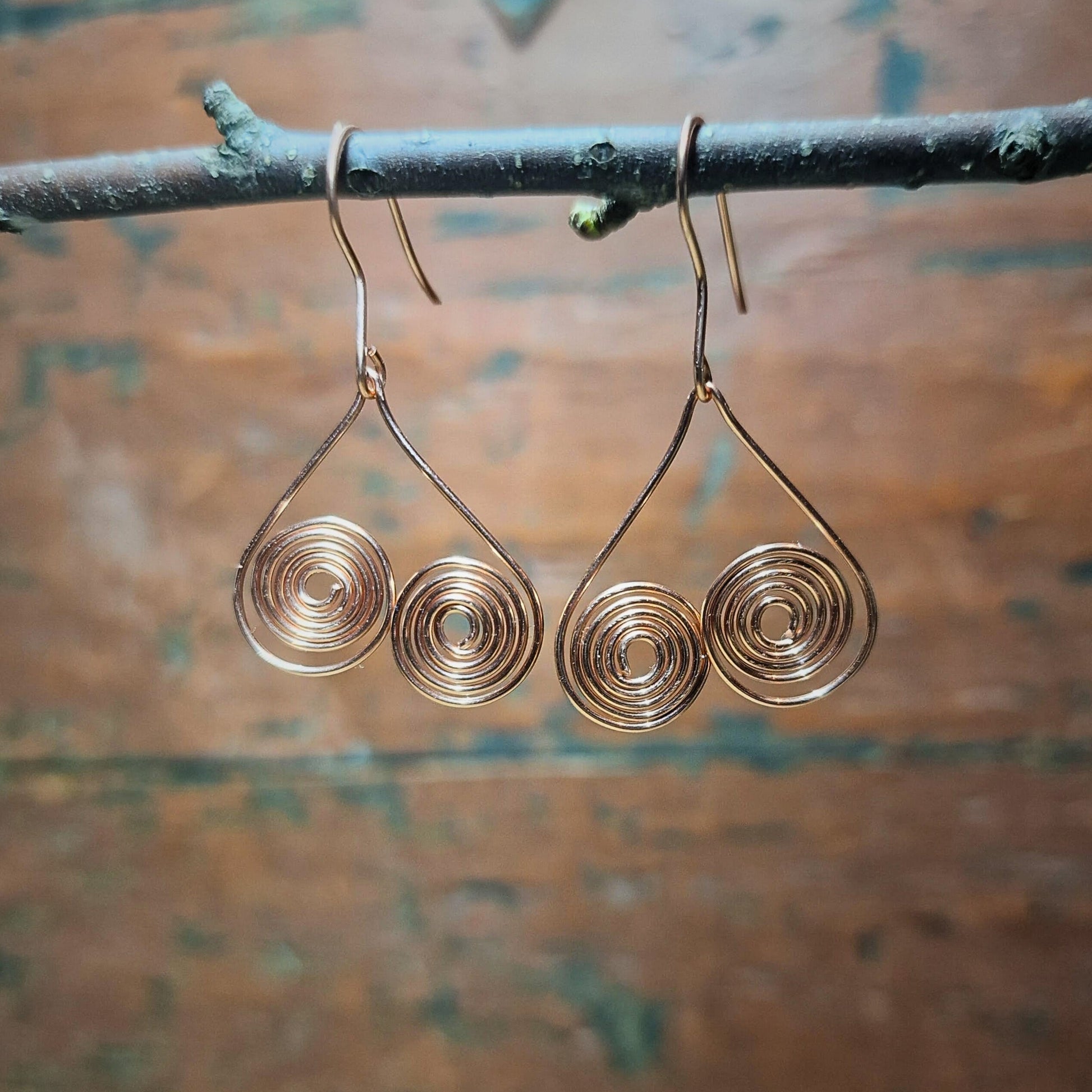Ett vakkert spiraldesign som er utformet som ett hjerte som henger opp-ned. Kobberets varme glød gir øredobbene et rustikt og sofistikert uttrykk, mens den lette vekten gjør dem behagelige å bruke hele dagen. Ørekrokene er også laget av kobbertråd av høy kvalitet, noe som sikrer både komfort og holdbarhet