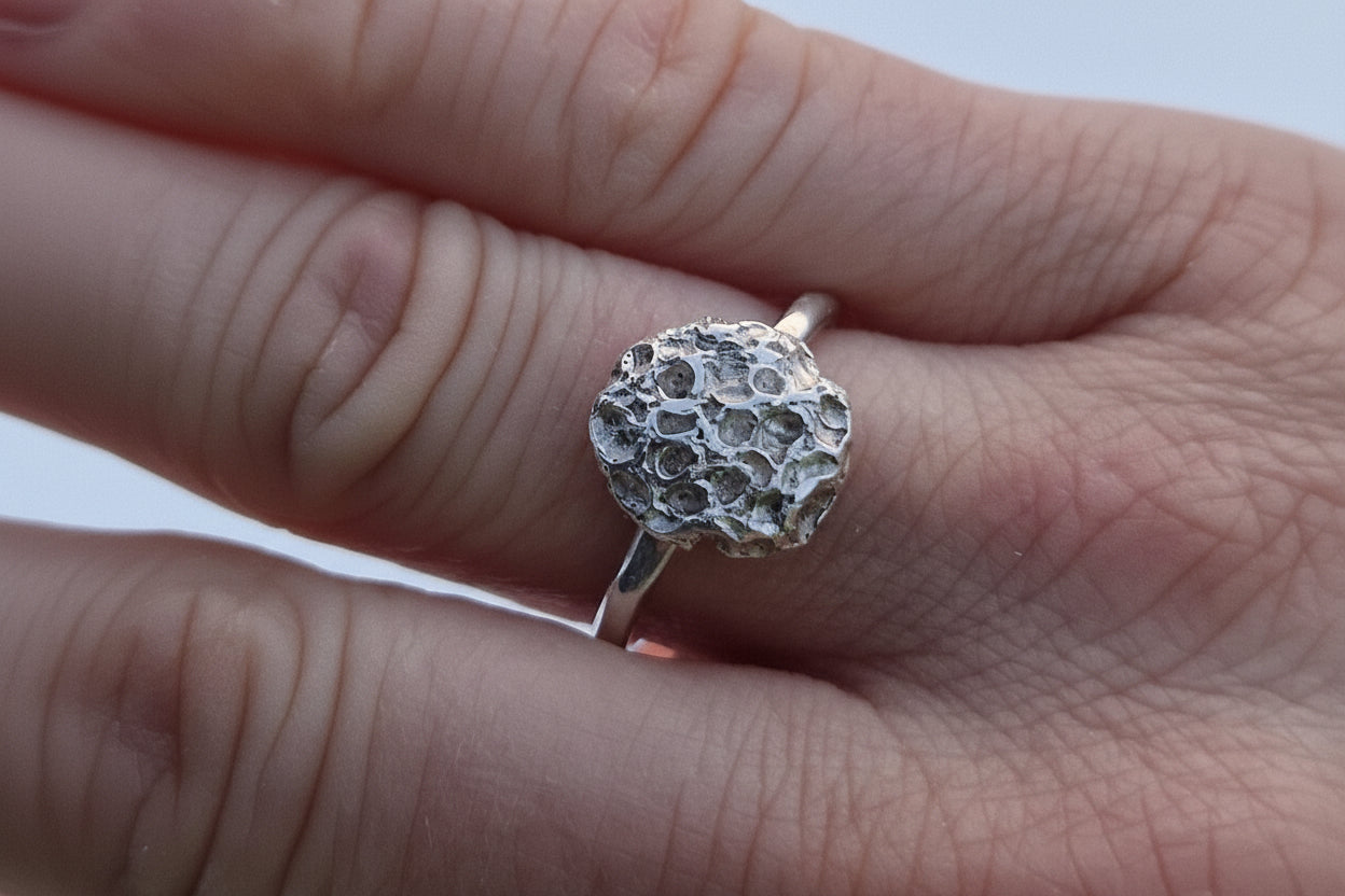 Dekoren er inspirert av marine koraller sin struktur, og er formet i sølvleire, som etter brenning gir ett smykke i 999 sølv.