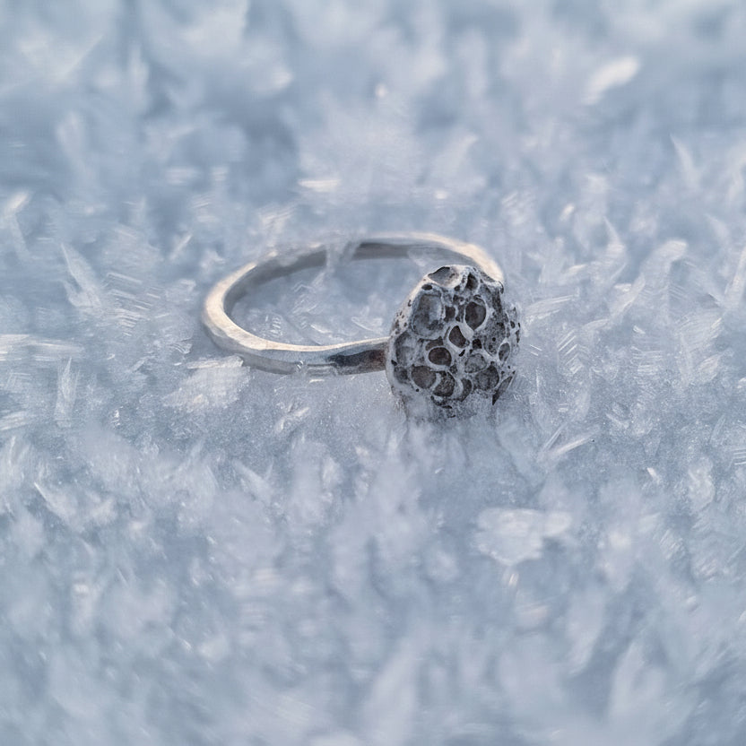 Korall er en håndlaget og håndpreget ring i 999 og 925 sølv.
