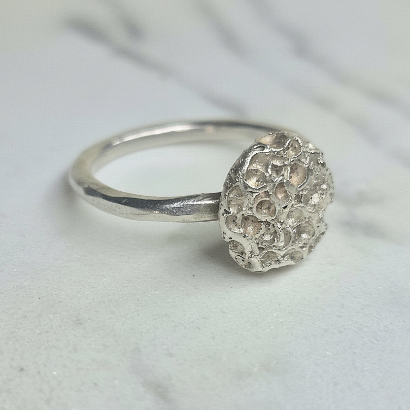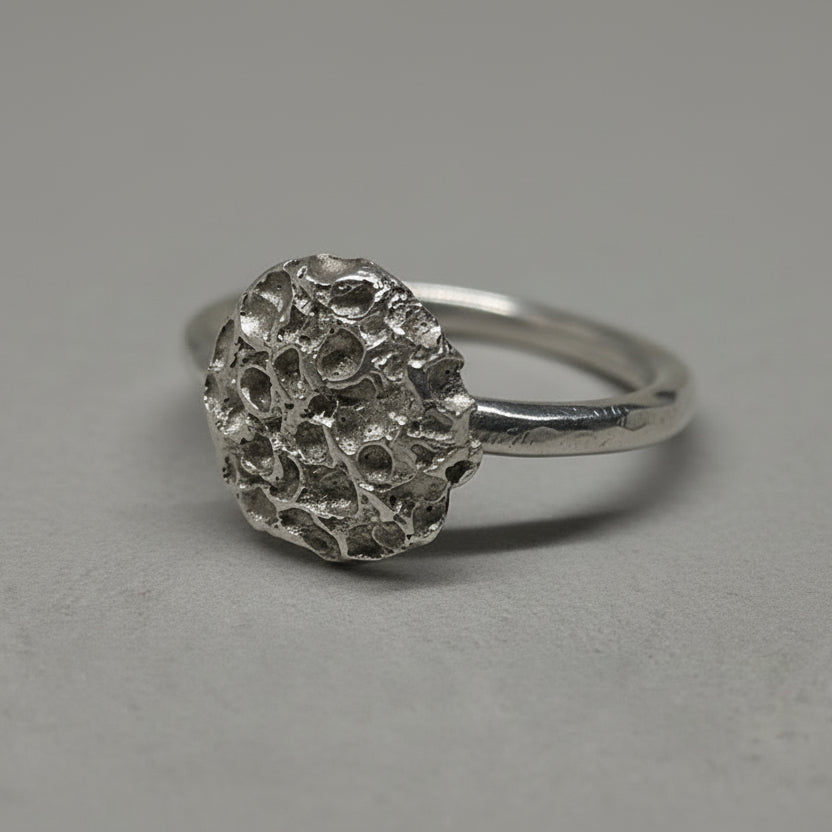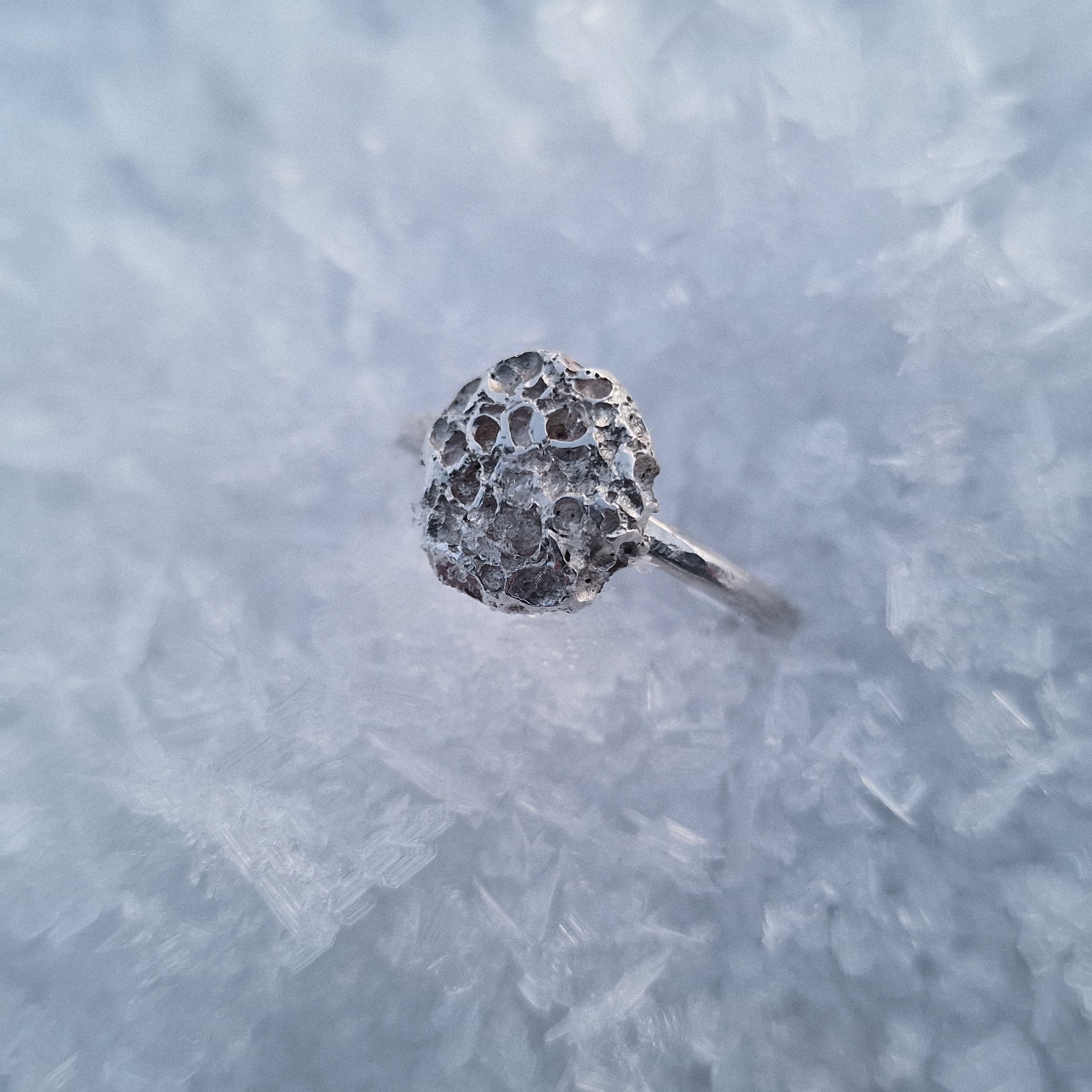 En vakker ring med organisk utrykk. Siden den er håndlaget vil det være noe variasjon i strukturen på dekoren mellom hver ring. Så ingen er helt like.