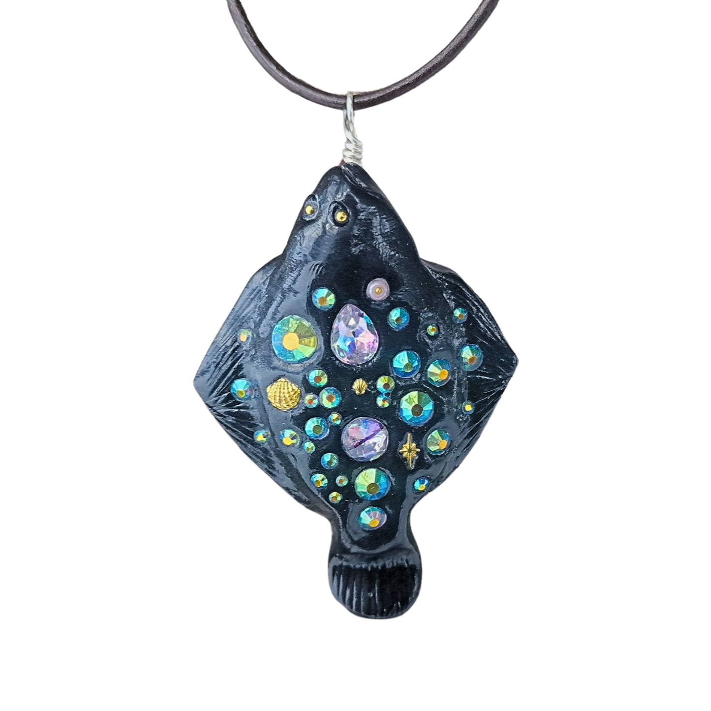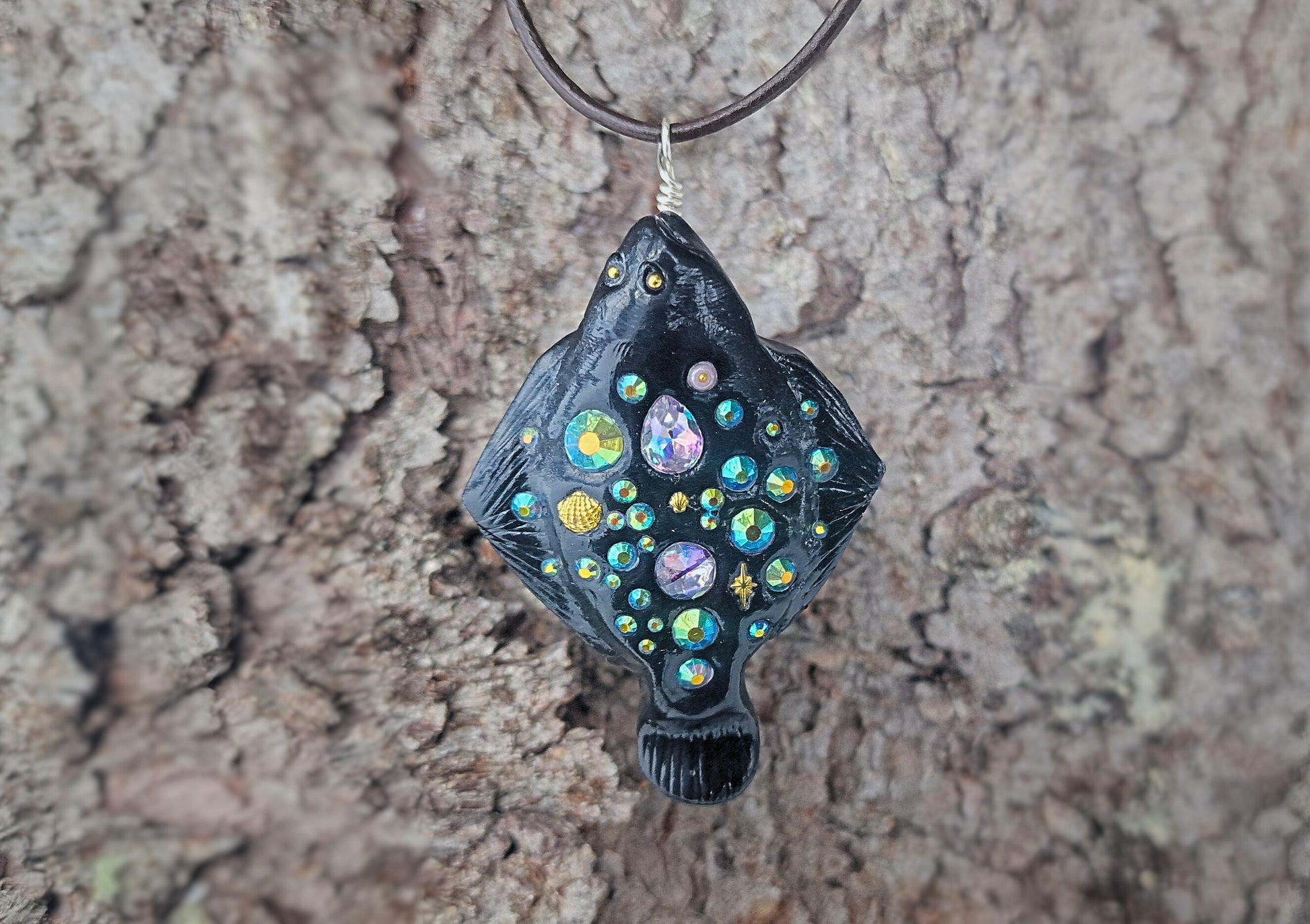Flyndra er håndformet i sort polymer og belagt med diverse glitter og glimmer. Dette er kanskje ikke i nærheten av en rekordfangst, men hele 7 cm er solid for ett smykke. Dette kveitesmykket er godt synlig i mengden.