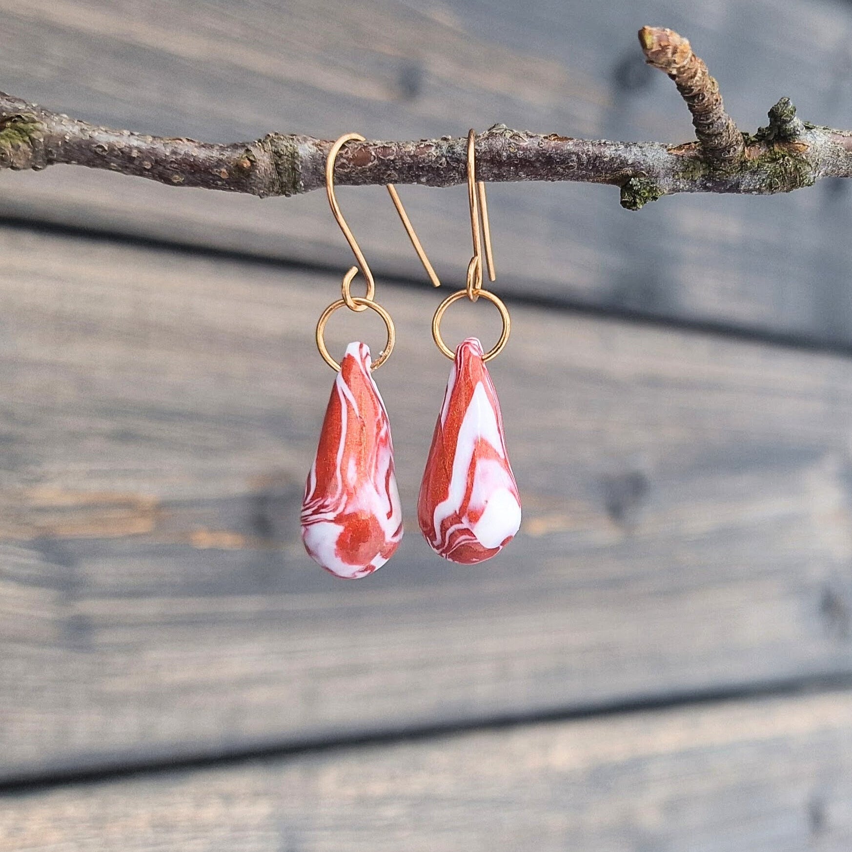 Disse elegante øredobbene er et unikt håndverk som kombinerer tidløs skjønnhet med moderne design. Dråpene er nøye håndformet i polymerleire og har en skimrende marmorering i dyp rød og hvit, som gir et sofistikert og iøynefallende uttrykk. Overflaten er lakket for en glansfull finish som fremhever de vakre detaljene og gir et eksklusivt preg. Disse finnes kun i ett eksemplar, så her kan man skaffe noe håndlaget og unikt som ingen andre har maken til.