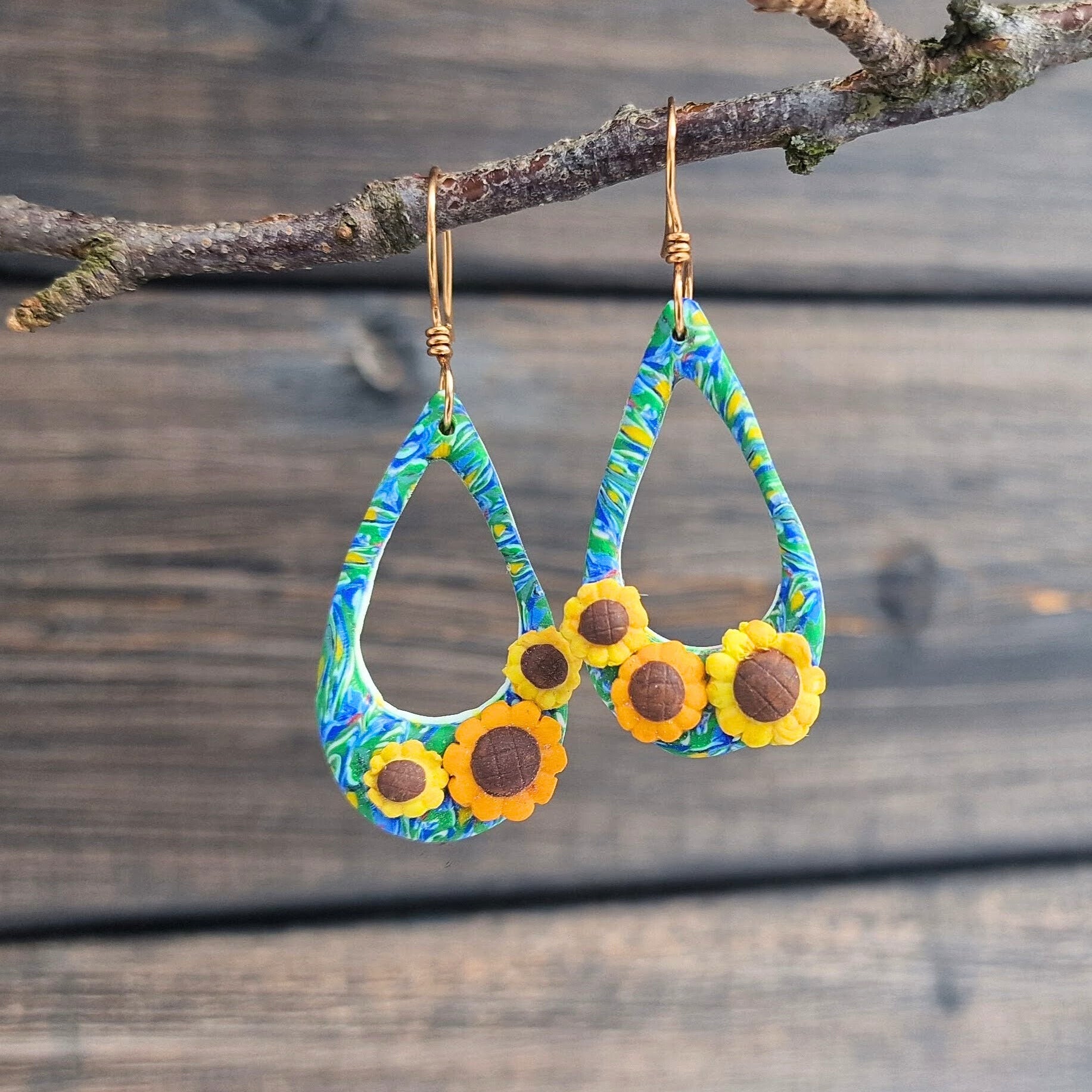 Øredobbene er håndformet i polymer leire, med organisk mønster i grønt, blått og orange med dekorative solsikker. Polymer er ett svært lettvektig materiale som gjør disse lete og behagelige og bruke.