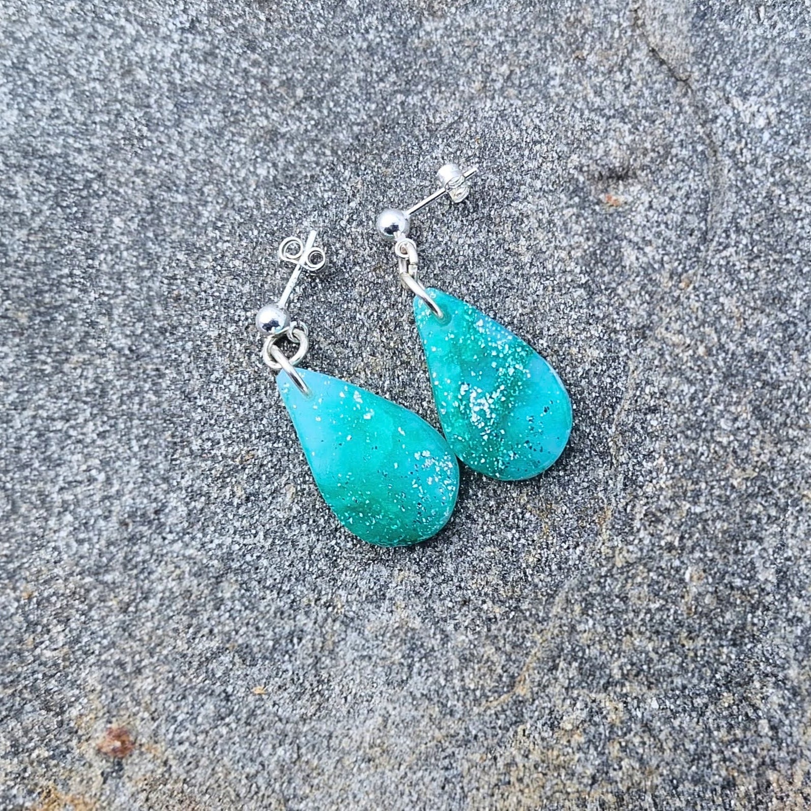 Disse øredobbene har en vakker marmorering i jadegrønn med sølvskimmer som har ett nydelig skimmer og fargespill i sollyset. Perfekt for de varme årstidene.