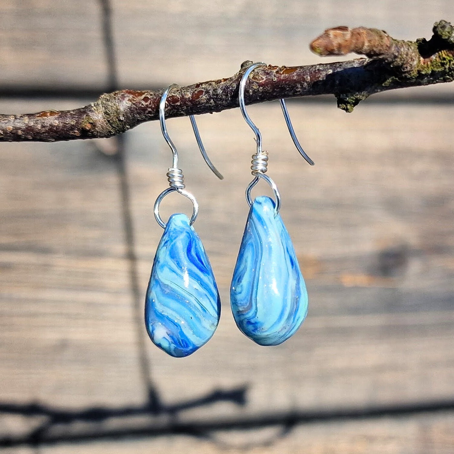 Vakre øredobber som passer like godt til stemningen ute på en frossen kald vinterdag, som til en varm dag på sommeren til sommerkjolen. De vakre organiske stripene i forskjellige blåtoner med små aksenter av sølv og hvit gjør at de virker både "vinterlige" og "sommerlige" på en gang.