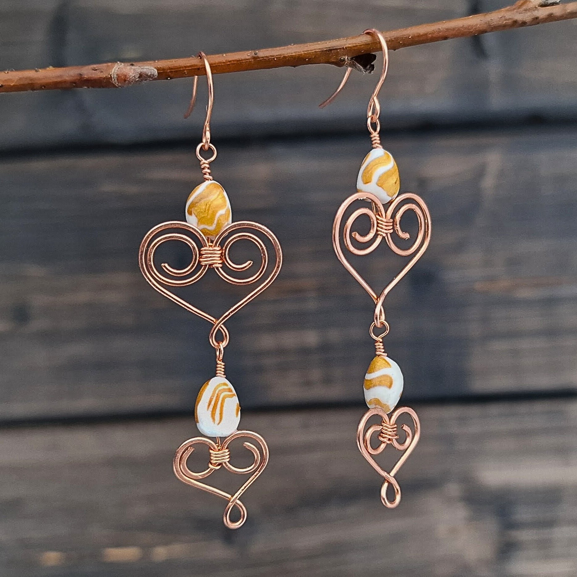 Disse søte øredobbene er laget av to hjerter i ulik størrelse som er pyntet med håndlagde perler i polymer.