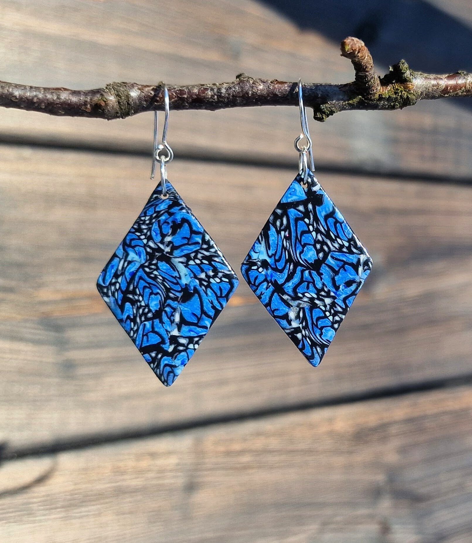 Stilige øredobber med spennende mønster i blåtoner, hvit og sølv på svart bakgrunn.