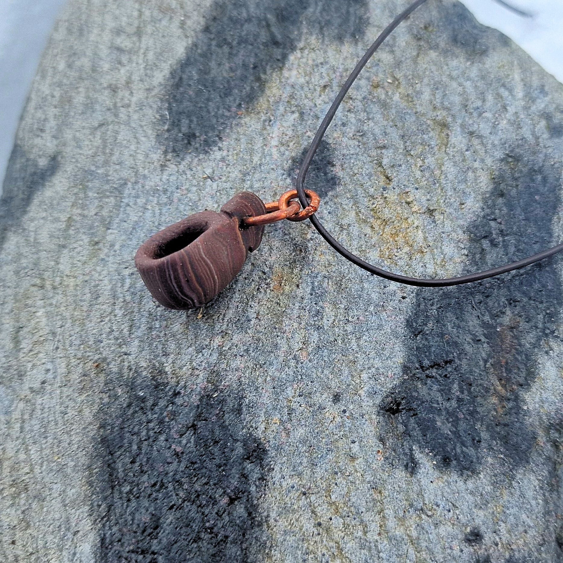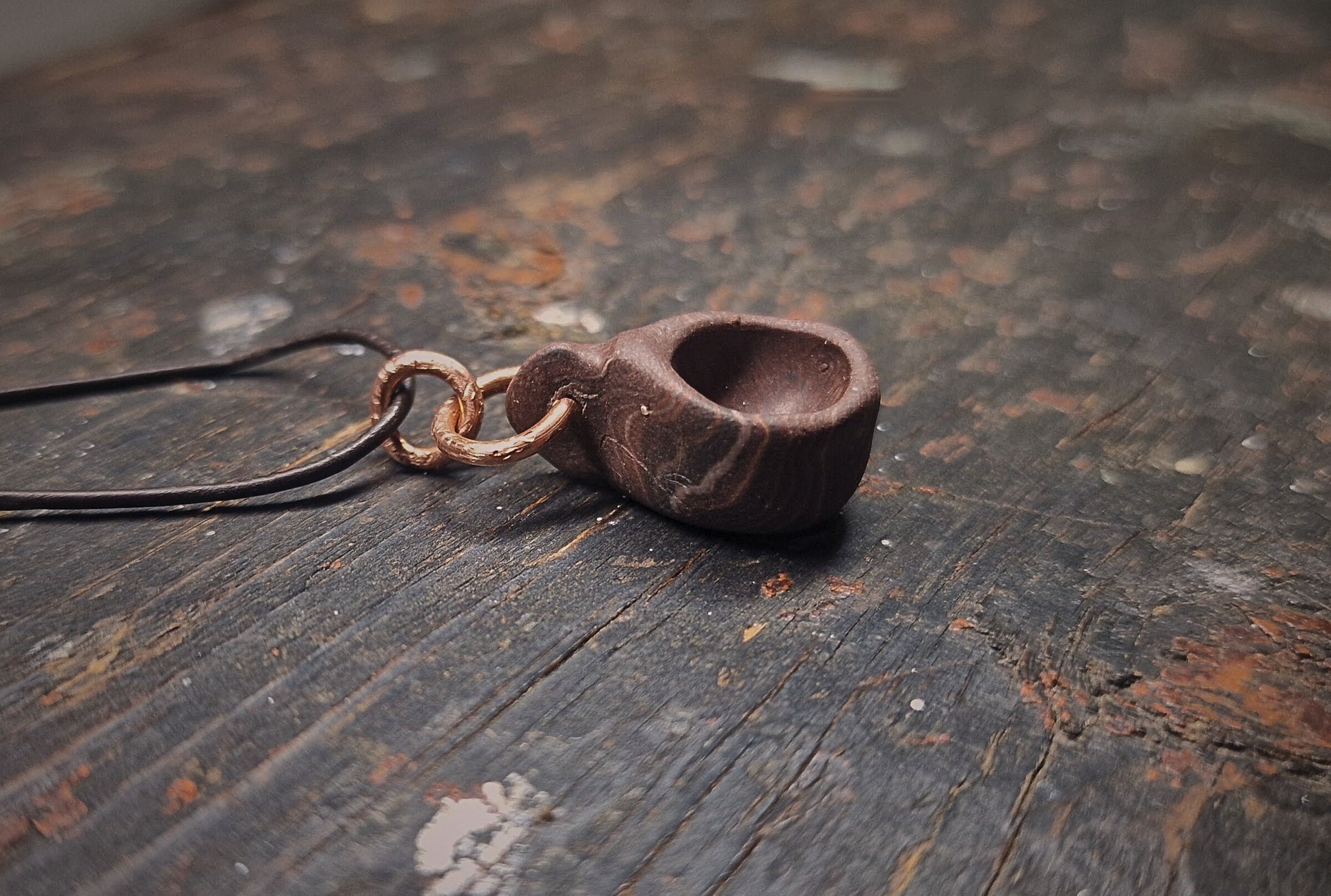 Smykket henger i en lærreim, med detaljer og krok i grov hamret kobber for et røft og rustikt utseende.