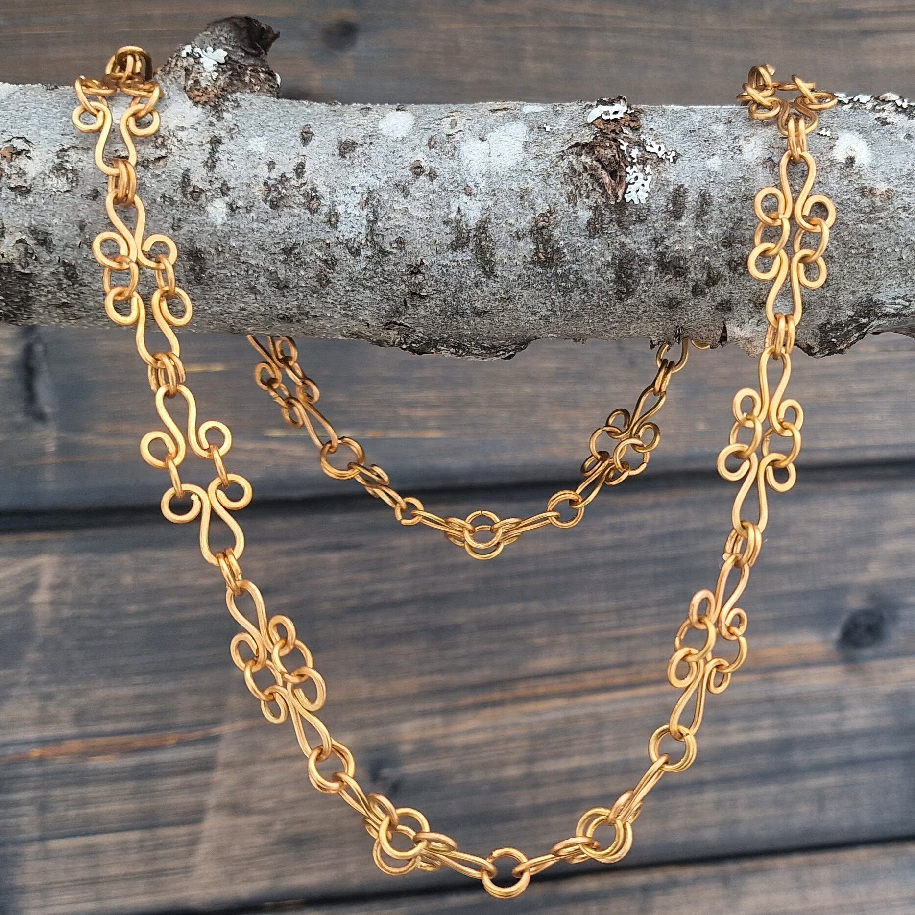 Dette unike smykket er laget i bronse og har et intrikat og repeterende lenkedesign som utstråler tidløs eleganse. Hvert ledd er nøye håndformet, hamret og koblet sammen, noe som gjør smykket 100% håndlaget av Kunstnerbonden på gårdens hjemmeverksted.